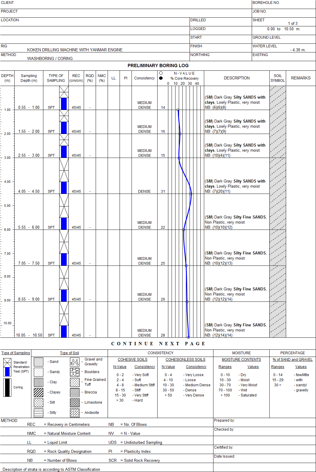 This is a sample spreadsheet for boring log which is very helpful for Geotechnical Engineers. Borehole logs are used to display the results of oil and gas, mining, geotechnical and environmental drilling and sampling. Logs can be used to display soil and rock samples.