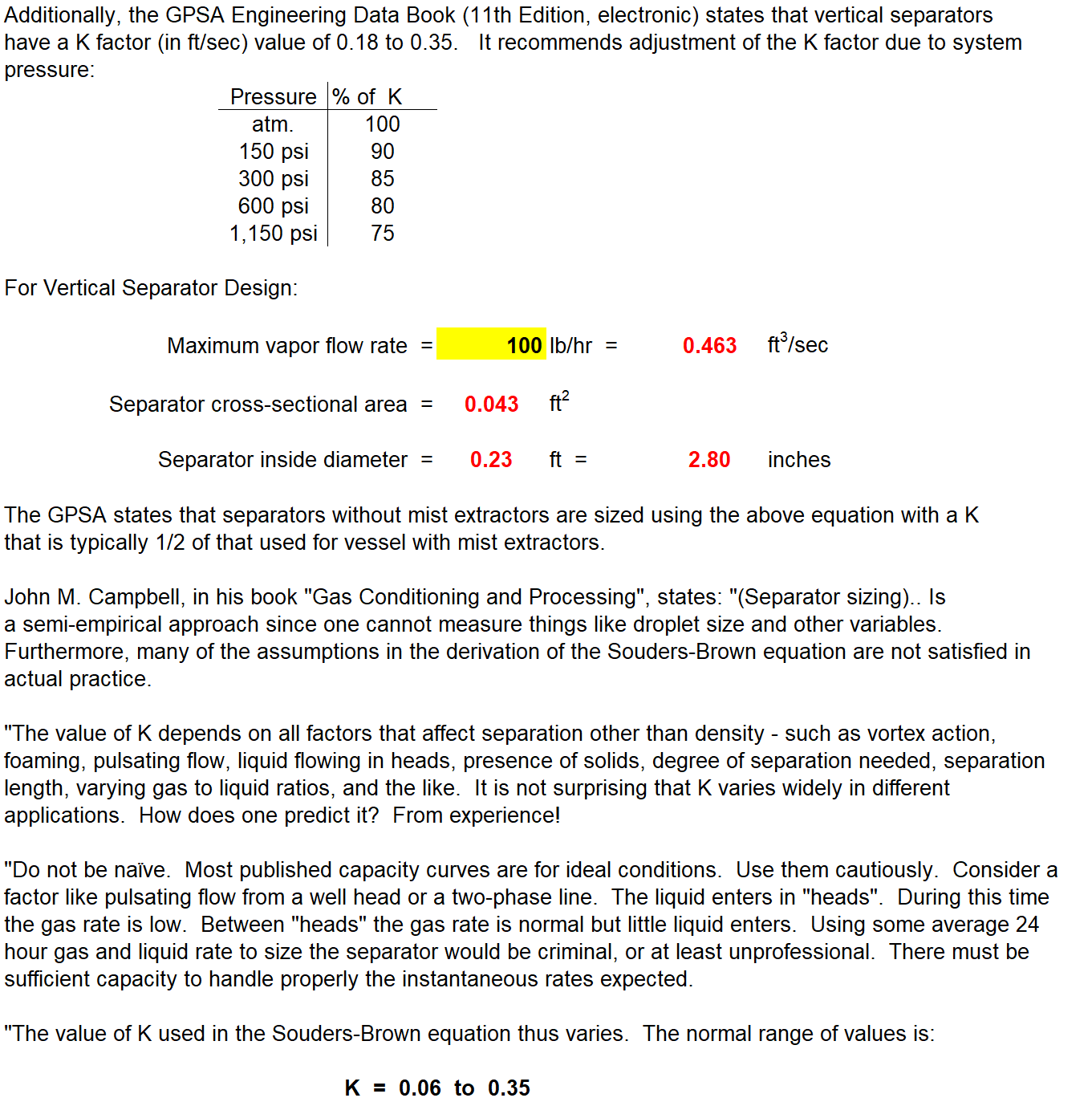 In a liquid-vapor separation vessel, there are typically three stages of separation. The first stage, primary separation, uses an inlet diverter to cause the largest droplets to impinge by momentum and then drop by gravity. The next stage is gravity separation of smaller droplets as the gas flows through the vapor disengagement section of the separator. The final stage is mist elimination, where the smallest droplets are coalesced on an impingement device, such as a mist pad or vane pack, followed by gravity settling of the larger formed droplets. In vessels like flare knockout drums, we are primarily concerned with gravity separation since they typically have no coalescing internals, such as mist pads.