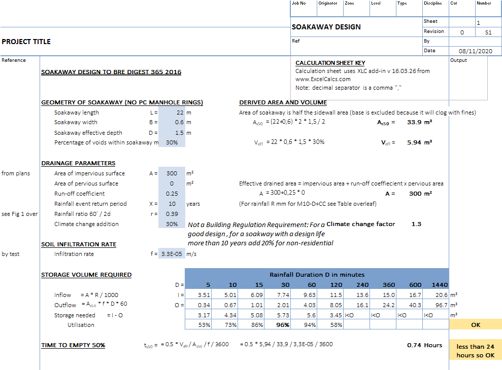 Soakaway design to BRE Digest 365 2016. Calculates the capacity utilisation and time to empty to 50% for a selected soakaway size, using impervious and pervious drained area, soil infiltration rate (f), rainfall intensity (r value), climate change, and selected rainfall event return periods. Suitable for use in England in Wales. Gives conservative figures which can be modified for Scotland and Northern Ireland. Uses Wallingford Procedure for return periods other then M10-D.
