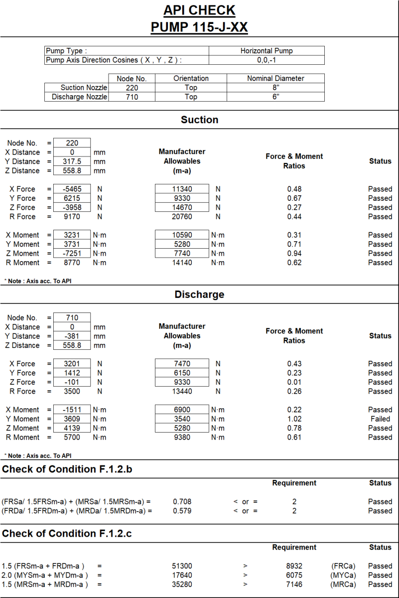 The Failed Condition: The discharge nozzle Y-moment (1.02 ratio) exceeds the manufacturer's allowable limit, meaning the piping system is bending the pump too much in that direction and requires design changes. The fundamental principle is protecting expensive rotating equipment by ensuring the piping doesn't impose loads that could cause mechanical failure, misalignment, or premature wear.