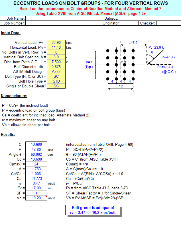 2.The elastic method worksheets, "Bolt Group(<=25)" and "Bolt Group(<=75)", can be used for all cases of in-plane and out-of-plane loads on the bolt group, or where geometry limitations of the AISC Tables XI through XVIII are ecceeded.The "elastic" method (AISC "Alternate" Method 1) will always give conservative results when compared to using the AISC Tables.