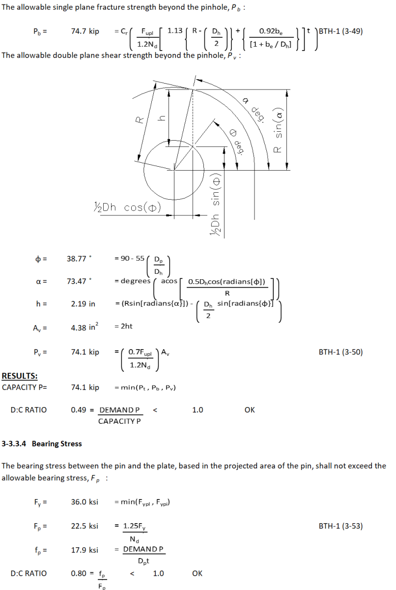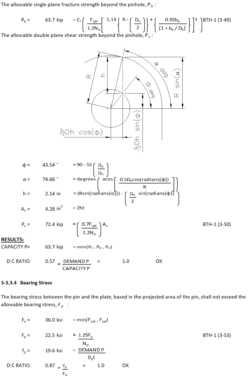 The strength of a pin-connected plate in the region of the pinhole shall be taken as the least value of the tensile strength of the effective area on a plane through the center of the pinhole perpendicular to the line of action of the applied load (Pt), the fracture strength beyond the pinhole on a single plane parallel to the line of action of the applied load (Pb), and the double plan shear strength beyond the pinhole parallel to the line of action of the applied load (Pv).
