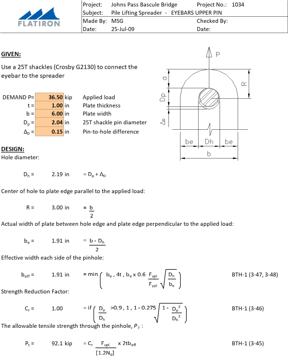 Design a Plate Lifting Beam and rigging plates to lift a 98 ft, 30" square PSC pile from the pile head using an embedded 2" ID PVC sleeve thru the pile width. The lifter will be capable of crane hook access and transfer the pile load from the lifting pin to the hook by means of independent eyebars from the pin to the plate spreader beam, shackles and a plate lifting beam connected to the hook.