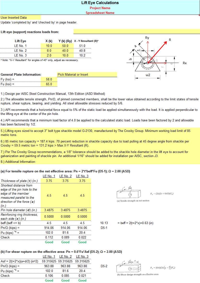 User inserts loading, lifting eye dimensions, and material properties. Spreadsheet is unprotected and safety factor assumptions can be adjusted.