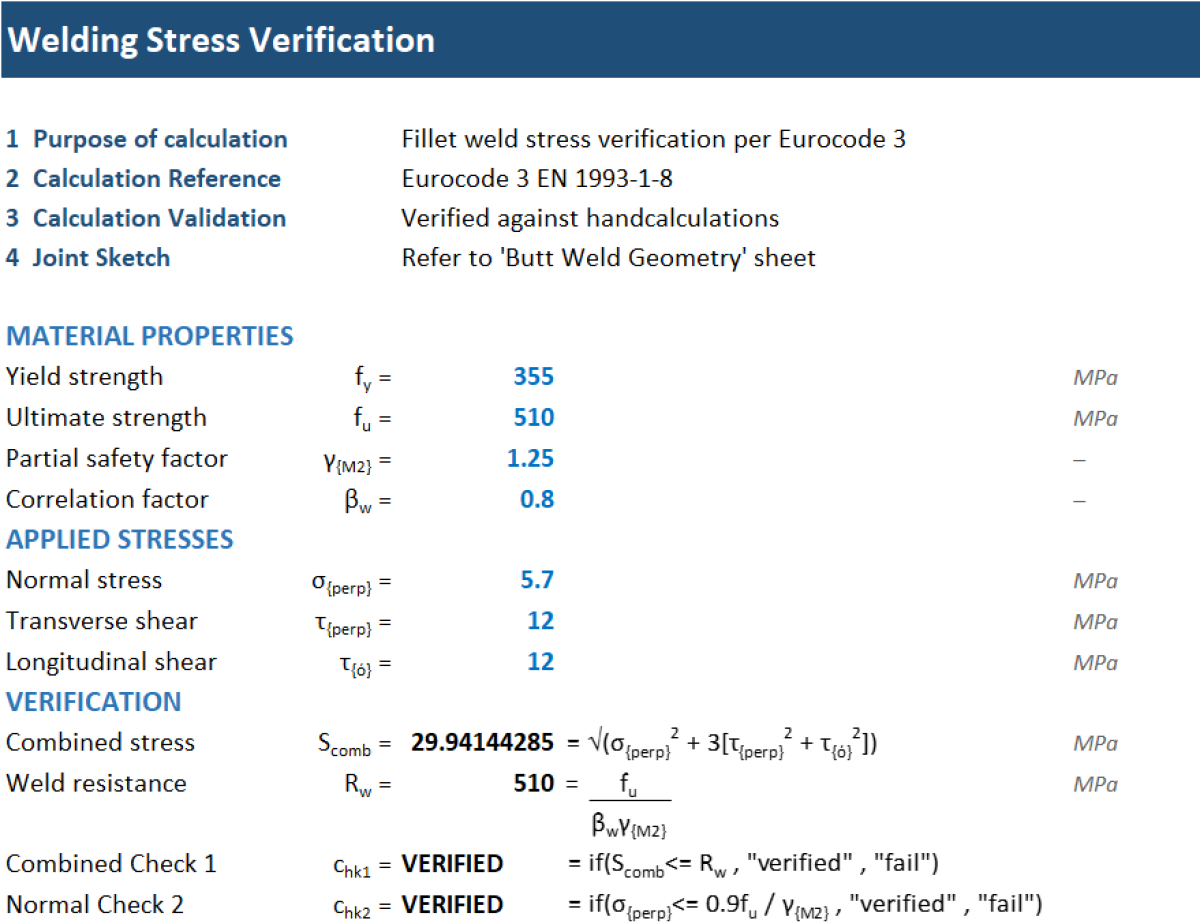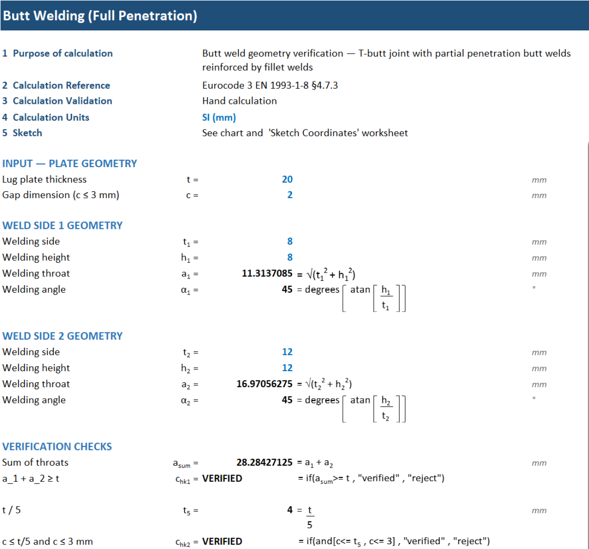 This calculation provides a comprehensive design and verification tool for T-butt joints with partial penetration butt welds reinforced by fillet welds, in accordance with Eurocode 3 (EN 1993-1-8).