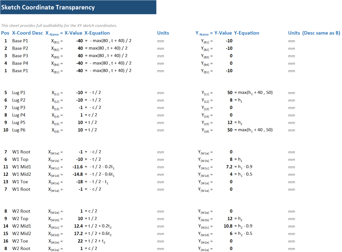 - Position-Based Audit: Every vertex in the drafting logic is assigned a unique position number, mapped directly to a fully auditable "Sketch Coordinates" sheet with XLC rendered equations.