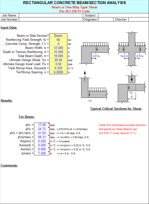 'RECTBEAM' is a spreadsheet program written in MS-Excel for the purpose of analysis/design of rectangular beam or column sections. Specifically, the ultimate moment capacity, bar spacing for crack control, moments of inertia for deflection, beam shear and torsion requirements, and member capacity for flexure (uniaxial and biaxial) with axial load are calculated. There is also a worksheet which contains reinforcing bar data tables. This version is based on the ACI 318-11 Code.