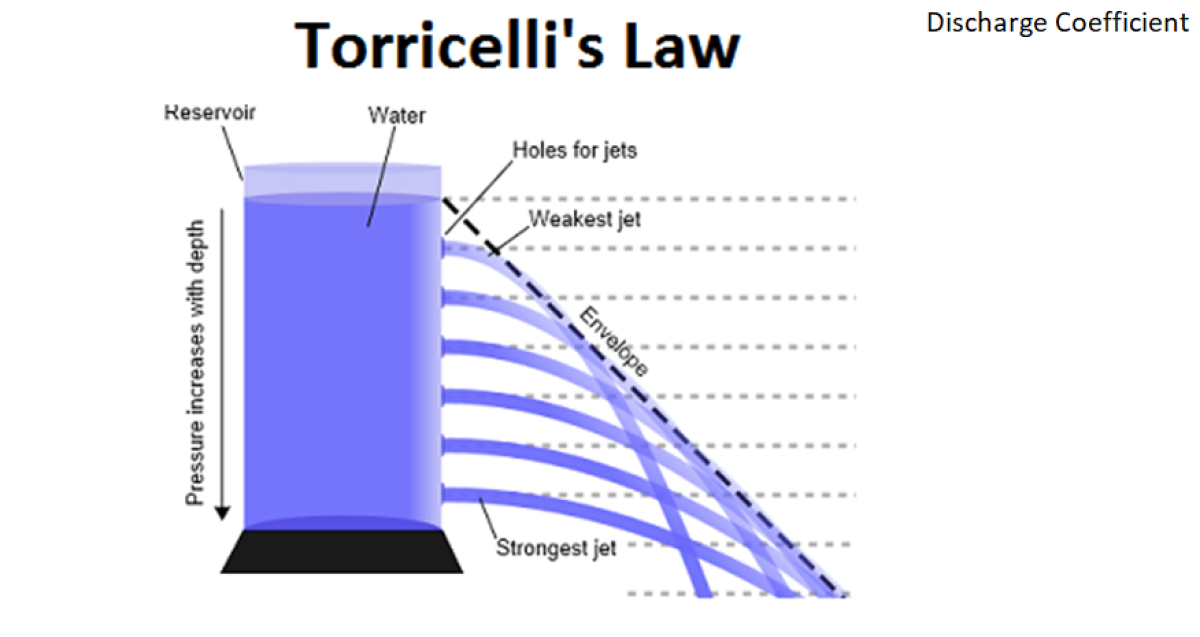 Torricelli's Law: The velocity of liquid flowing from an orifice depends on the height of liquid above the opening, following the relationship V = √(2gh). This is modified by a discharge coefficient to account for real-world losses.