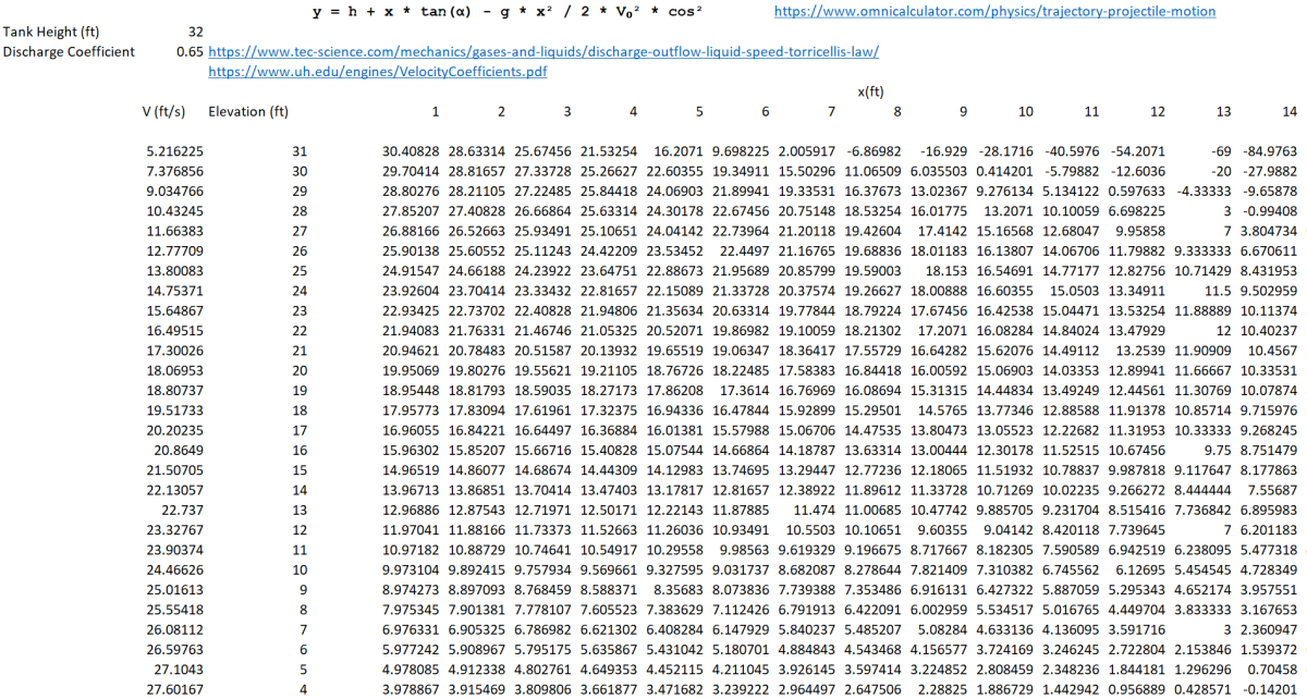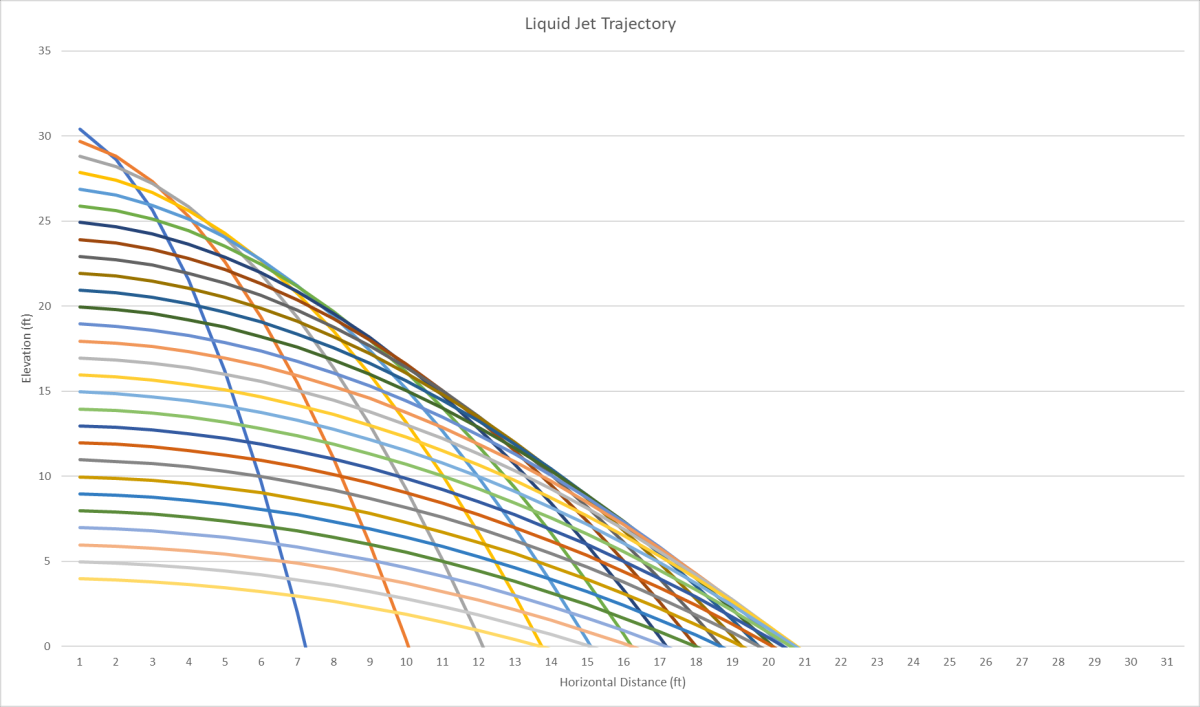 - Computes trajectory paths at multiple liquid levels (31 ft down to 4 ft)